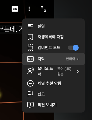 만약에 영어자막이 나온다면 점 3개 버튼을 눌러서 한국어로 자막을 바꾸면 됩니다.